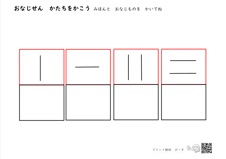 「同じ線 形はどれ」の教材では、見本と同じ線や形のものを選択肢の中から選択していましたがこのプリントは見本と同じ線や形を書いていくプリントとなります。同じ線や形を選択できるようになってきたら実際に書く練習を段階的に取り組んでいただくと一人で書ける線や形が増えていくと思います。